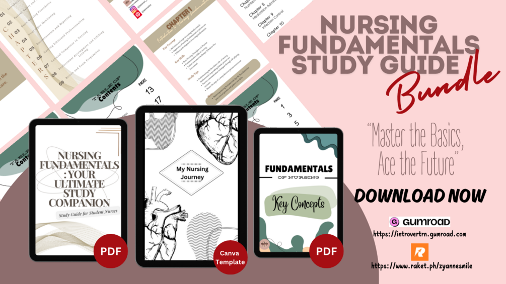 1 PDF Nursing Fundamentals: Study Guide (9 pages) ,1 PDF Nursing Fundamentals: Key Concept (+30 pages with 12 Chapters) + 1 Canva Template Nursing Journal/ Planner (10 pages that you can edit and use repeatedly)